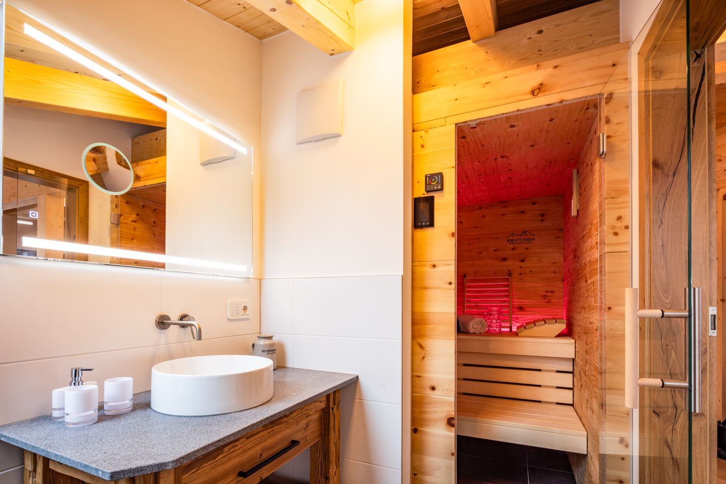 Das Schlafzimmer ist mit einem komfortablen Doppelbett aus Zirbenholz ausgestattet. Der natürliche Duft des Holzes sorgt für erholsamen Schlaf und ein besonderes Raumklima. Das moderne Badezimmer verfügt über eine großzügige Regendusche und eine private Zirbensauna mit zusätzlicher Infrarotfunktion, die nach einem aktiven Tag in den Bergen wohltuende Entspannung schenkt.
