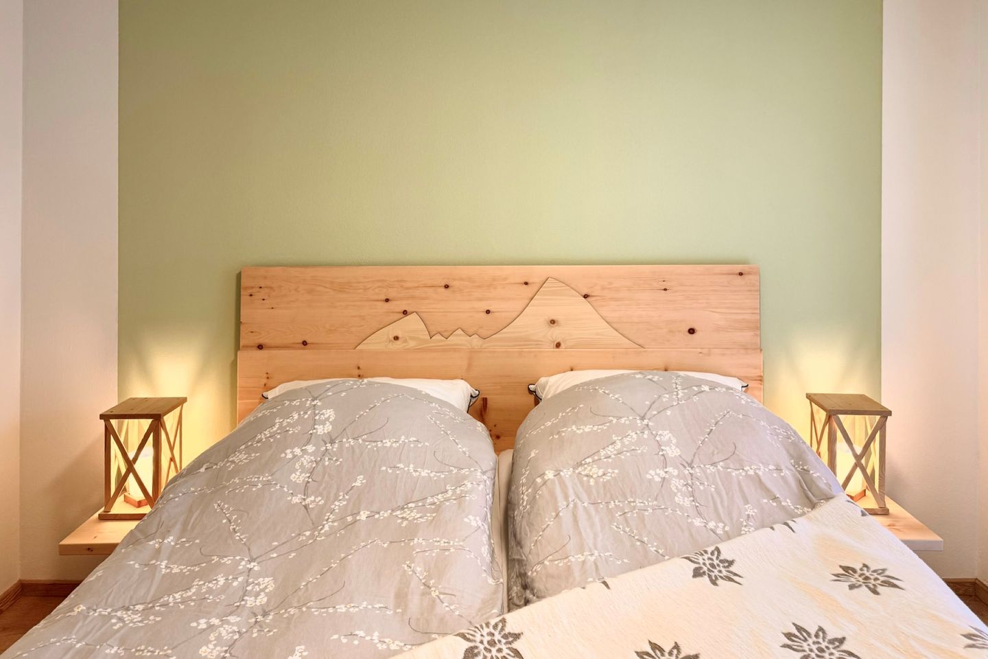 Im Mittelpunkt steht das handgefertigte Zirbenholz-Bett (180x200 cm) mit geschnitzter Watzmann-Silhouette. Das natürliche Holz sorgt für ein angenehmes Raumklima und einen besonders erholsamen Schlaf.