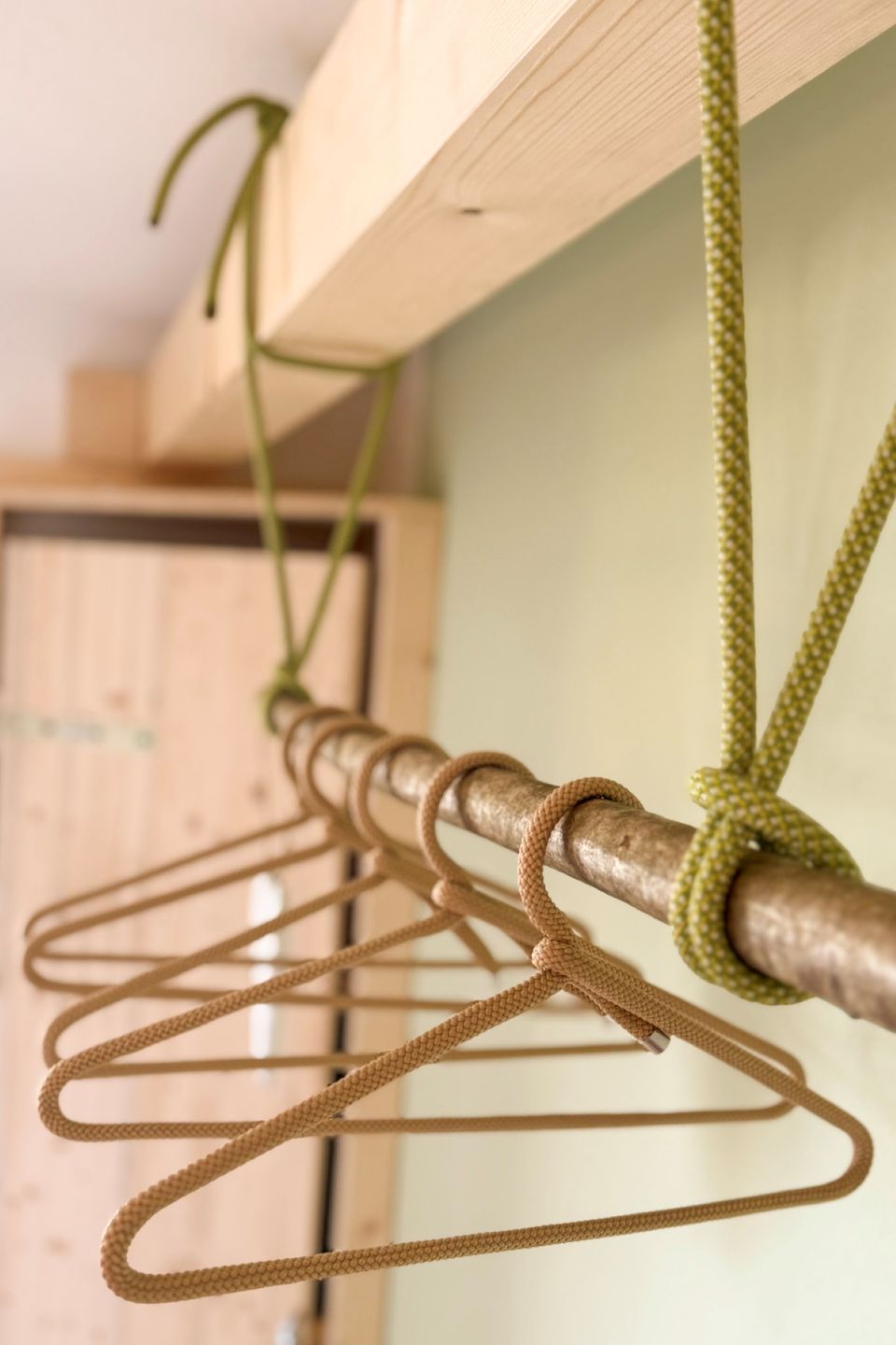 Auch die übrige Einrichtung – vom selbst entworfenen Massivholz-Mobiliar bis zur liebevoll handgefertigten Kletterseil-Garderobe – spiegelt unsere Verbundenheit mit den Bergen wider und verleiht der Wohnung ihren einzigartigen Charakter.