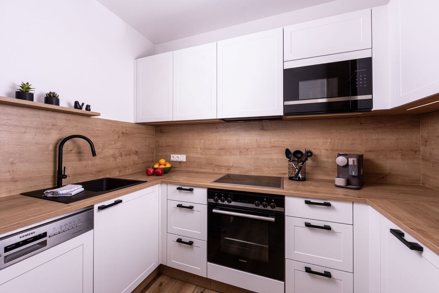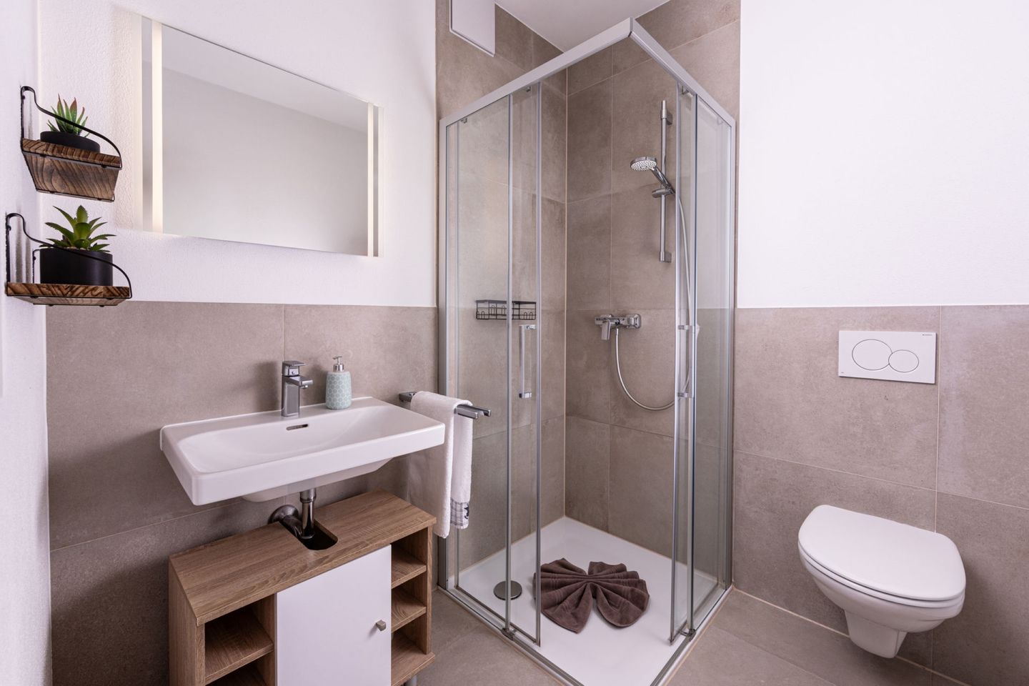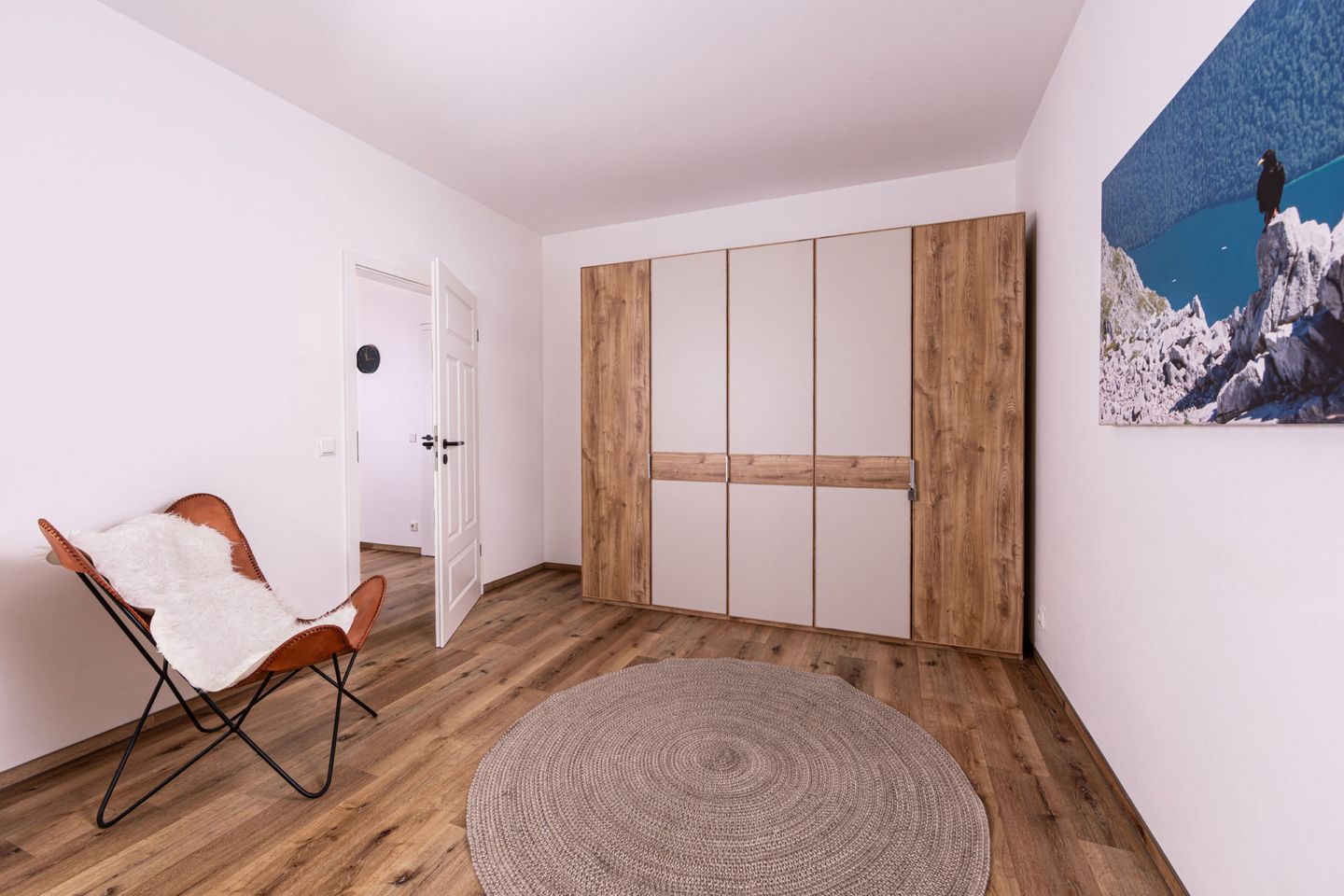 Das separate Schlafzimmer ist mit einem komfortablen Doppelbett und Kleiderschrank ausgestattet. Im wohnlichen Wohnzimmer laden eine bequeme Sofaecke mit Flachbild-TV und ein Esstisch zum Verweilen ein. Die voll ausgestattete Küche bietet alles, was Sie zum Kochen und Genießen brauchen – von Ceranherd, Backofen und Spülmaschine bis hin zu Mikrowelle, Kühlschrank mit Gefrierfach, Kaffeemaschine, Nespresso-Maschine, Wasserkocher und Toaster. Das moderne Bad verfügt über eine ebenerdige Dusche, WC und Haartrockner.